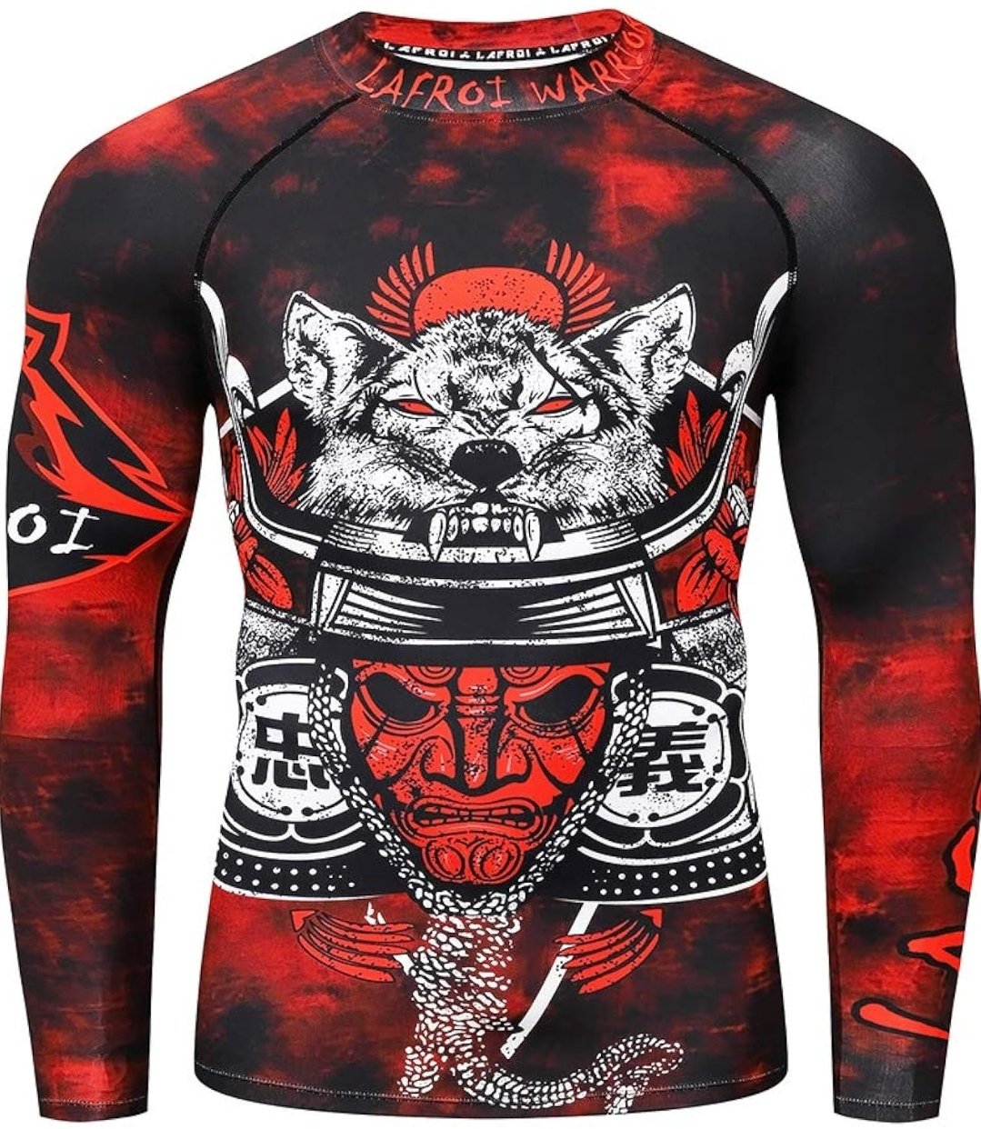 Samurai black and red rashguard for jujitsu training or fitness training.